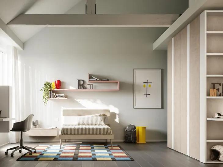 Questa proposta in melaminico ultima alla perfezione le qualità pratiche e il valore estetico della camaretta, poiché è capace di unire ergonomia e sicurezza. Nella progettazione della stanza dei piccoli affidati a noi: nel nostro punto vendita presentiamo tutte le più esclusive composizioni arredative moderne per la loro camera. Mistral mette a disposizione un ricco catalogo di elementi accessori da accostare su misura: troverai letto, armadio, tavolo da lavoro, sedie e librerie. Porta valore estetico e tonalità vivaci nella stanza dedicata ai bambini con questa proposta, una tra le Camerette componibili per ragazzi di Mistral. Se cerchi idee creative per progettare alla perfezione la stanza dei tuoi bambini, ti presentiamo la Cameretta Composizione Letto a Terra 18 di Mistral con finitura in melaminico.